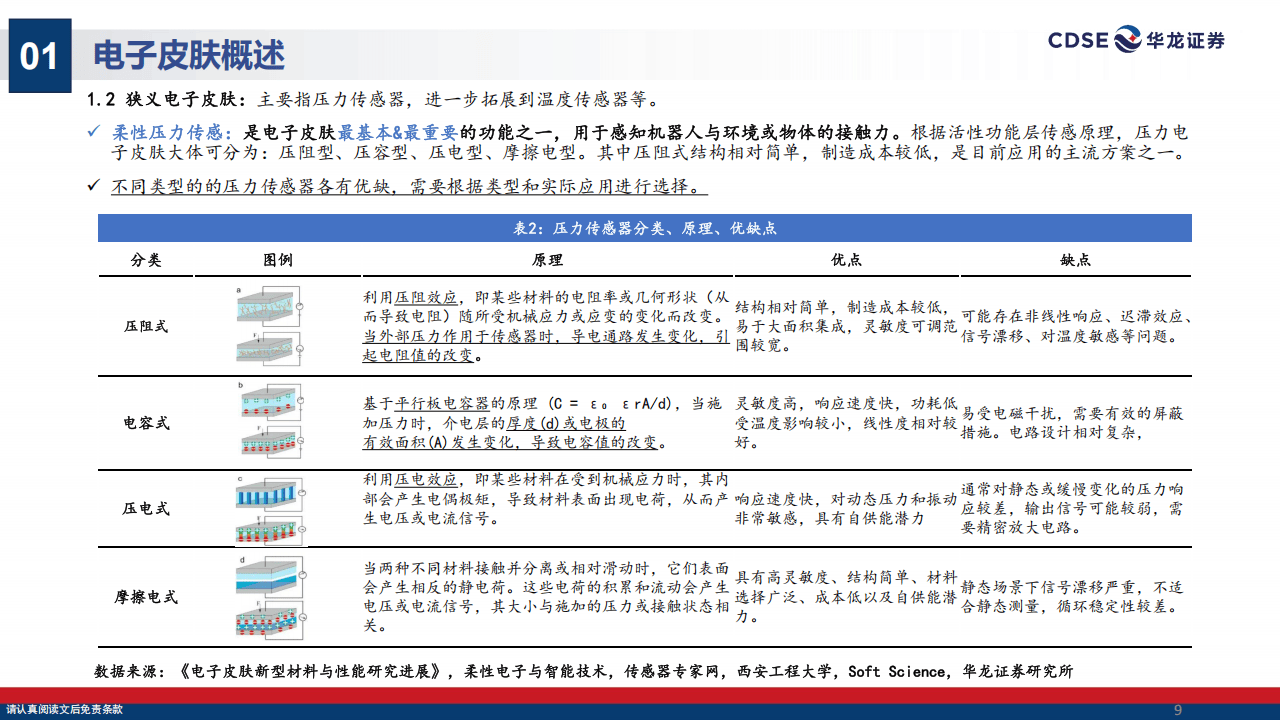 根据传感原理的不同,主流电子皮肤可分为压阻型、电容型、压电型和摩擦电型四类。其中,压阻型因结构简单、成本较低,成为目前商业化应用最广的方案,像特斯拉Optimus机器人的手部触觉传感器便采用类似技术,能感知0.1N级别的微小压力变化;电容型则以灵敏度高、线性度好的优势,适合对精度要求更高的场景;压电型和摩擦电型则因具备“自供能潜力”,在无线传感、可穿戴设备等领域展现出独特价值,不过目前在静态压力感知上仍存在短板。