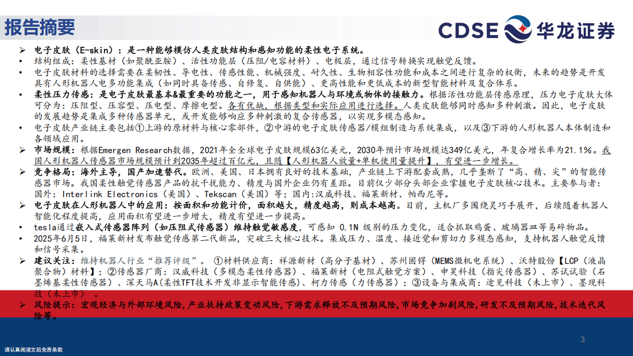 从技术探索到商业化落地,电子皮肤正推动人形机器人从“能行动”向“会感知”跨越。随着材料成本下降、性能提升,以及更多应用场景的打开,这一技术不仅将重塑人形机器人的发展路径,也将为医疗、工业、消费电子等领域带来全新变革,开启“感知即未来”的智能时代。