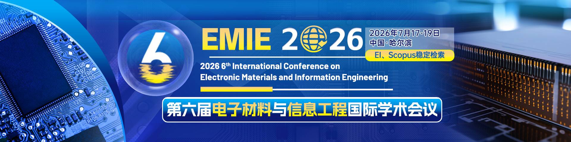 会议简介第六届电子材料与信息工程国际学术会议(EMIE 2026)将于2026年7月17-19日在中国哈尔滨召开。本会议聚焦电子材料与信息工程领域的最新科学研究和发展趋势,分享提高产业的竞争力的方法和策略。此次会议为广大学者和产业界提供了解学术发展趋势、拓宽研究思路、加强学术研究和探讨、促进学术成果交流和产业化合作的平台,推动电子材料与信息工程领域的高质量发展。大会诚邀国内外高校与科研机构学者、工程师、技术研发人员、企业优秀代表等参会交流,探讨分享最新的研究成果。