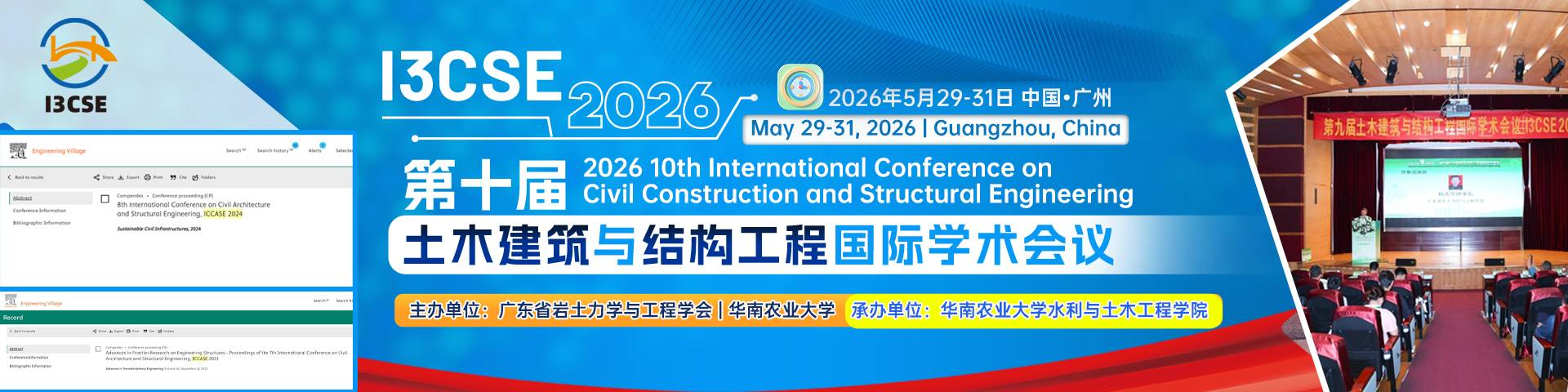 第十届土木建筑与结构工程国际学术会议(I3CSE 2026)将于2026年5月29-31日在广州举办,由广东省岩土力学与工程学会、华南农业大学主办。随着城市化进程加快和基础设施需求增加,土木工程面临着新材料、智能建造、可持续发展以及抗震设计等多重挑战和机遇。会议将围绕现代工程技术的最新进展,探讨智慧城市、绿色建筑和结构健康监测等领域的前沿研究和应用。通过分享创新研究成果与经验,I3CSE 2026致力于推动国际间的合作,促进专业知识的传播,提高土木建筑行业的整体水平与应对能力,为全球可持续发展贡献智慧和力量。