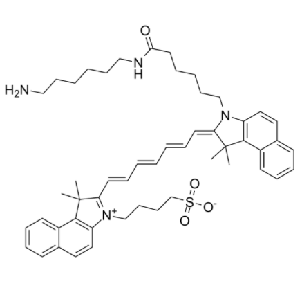 ICG-Amine 的核心结构是吲哚菁绿的多环共轭体系,两端通过乙撑链与氨基相连。氨基具有强亲核性,可以与活性酯(NHS ester)、醛、异氰酸酯或环氧化合物等形成稳定的共价键。这一特性使 ICG-Amine 成为理想的荧光标记试剂,可以方便地与蛋白质、抗体、肽类、纳米材料等生物分子结合,实现靶向标记与成像。