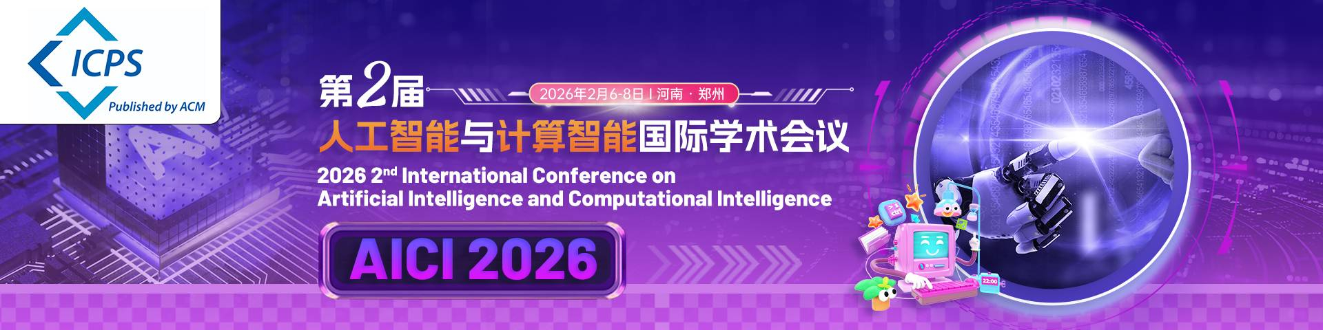 会议简介为了适应新时代的快速发展,2026年第二届人工智能与计算智能国际学术会议(AICI 2026)定于 2026年 2 月 6-8 日在中国.郑州召开。AICI 2026 将围绕“人工智能与计算智能”的最新研究领域,为来自国内外高等院校、科学研究所、企事业单位的专家、学者、工程师等提供一个分享专业经验,扩大专业网络,面对面交流新思想以及展示研究成果的国际平台,探讨本领域发展所面临的关键性挑战问题和研究方向,以期推动该领域理论、技术在高校和企业的发展和应用,也为参会者建立业务或研究上的联系以及寻找未来事业上的全球合作伙伴。大会诚邀国内外高校、科研机构专家、学者,企业界人士及其他相关人员参会交流。