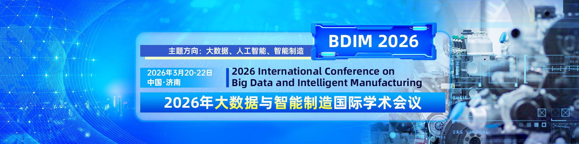 会议简介2026年大数据与智能制造国际学术会议(BDIM 2026)将于3月20日-22日在中国济南盛大召开,大会面向基础与前沿、学科与产业,聚焦“大数据驱动的智能制造”主题领域的新方法、新技术、新应用、新模式、新变革、新理念等方向,旨在打造一个学者、专家、研发者、技术人员学术交流的平台,促进科研成果、前沿技术的信息交流与共享,拓宽科研思路,加强学术研究和探讨,促进学术成果产业化合作的平台。大会诚邀国内外高校、科研机构专家、学者,企业界人士及其他相关人员参会交流。